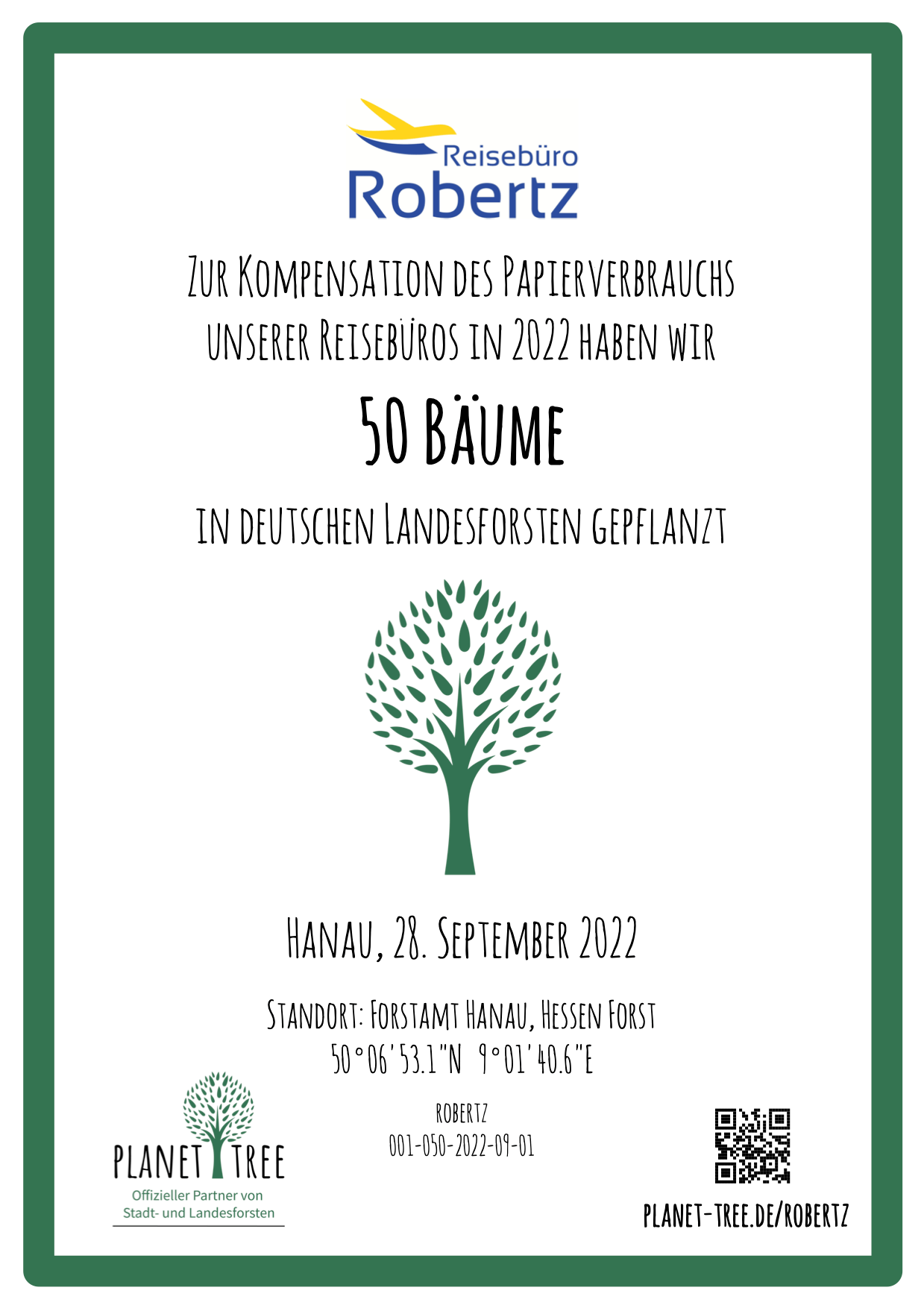Als Partner von Planet Tree leistet unser Reisebüro Robertz einen wertvollen Beitrag zum Klimaschutz. Wenn Sie erfahren möchten, wie auch Sie den Wald unterstützen - uns gleichzeitig jemandem eine Freude machen können - besuchen Sie planet-tree.de.